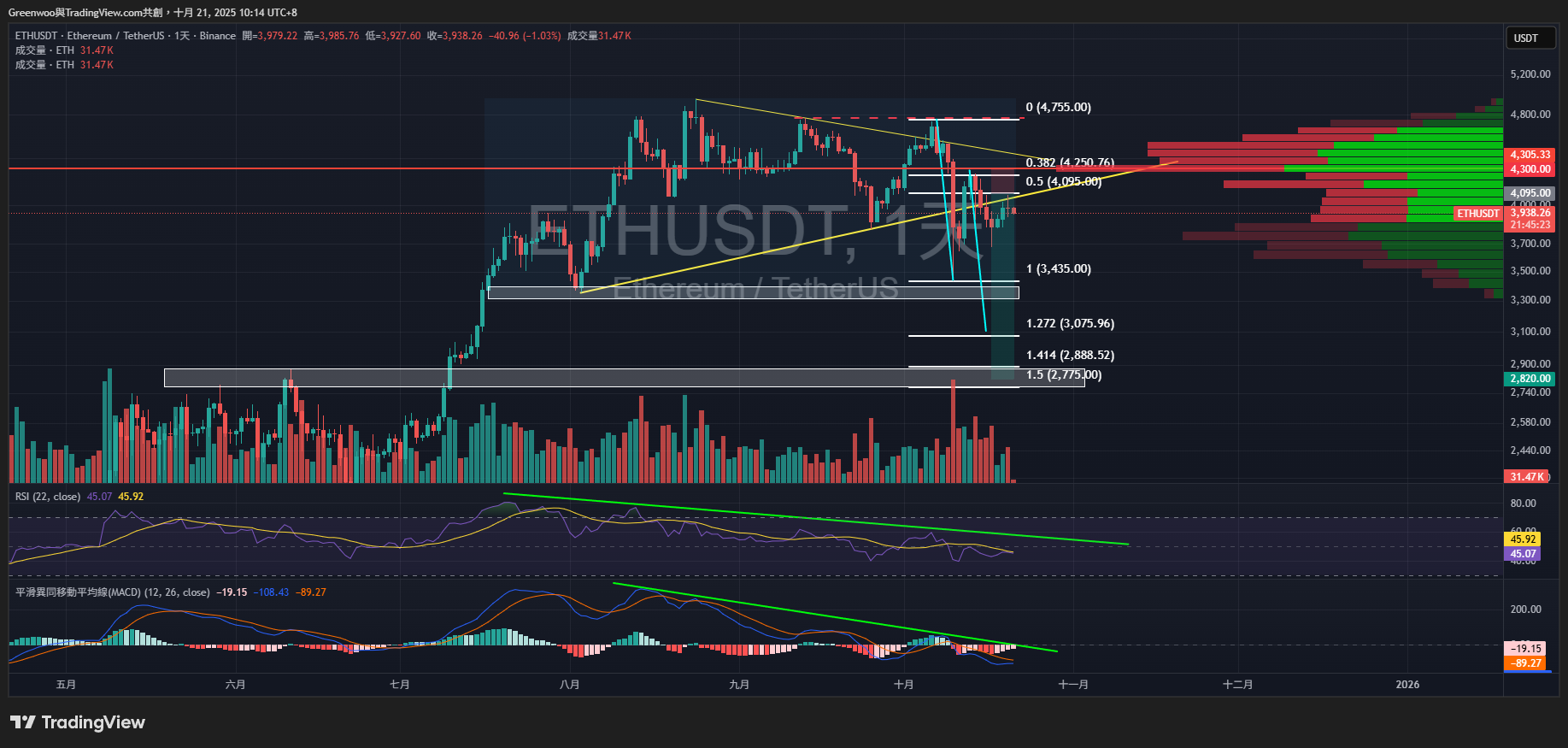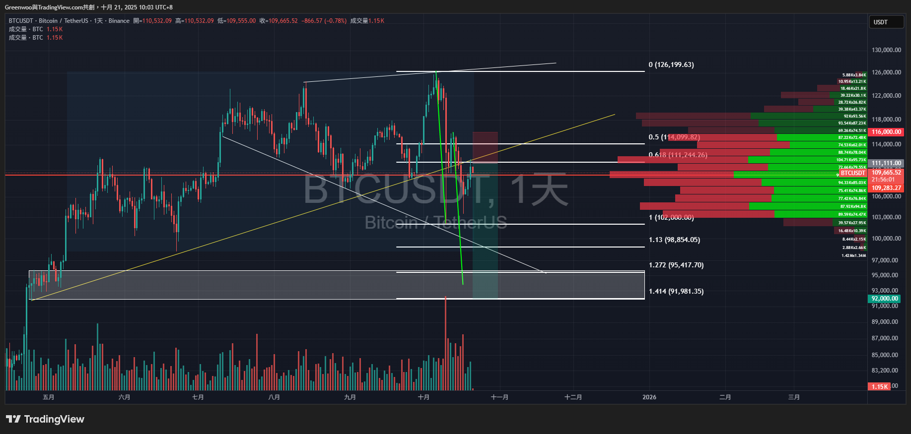 BTC昨日(10/20)回升上涨至111,705美元,但成交量并未和价格一同上涨,反而有降涨量减的趋势。同时该点位也是上升趋势线下缘和斐波0.618左右,有一定程度的压力。且从中型趋势来看,价格已然走成扩张顶排列(两条白色趋势线),空头意味浓厚。