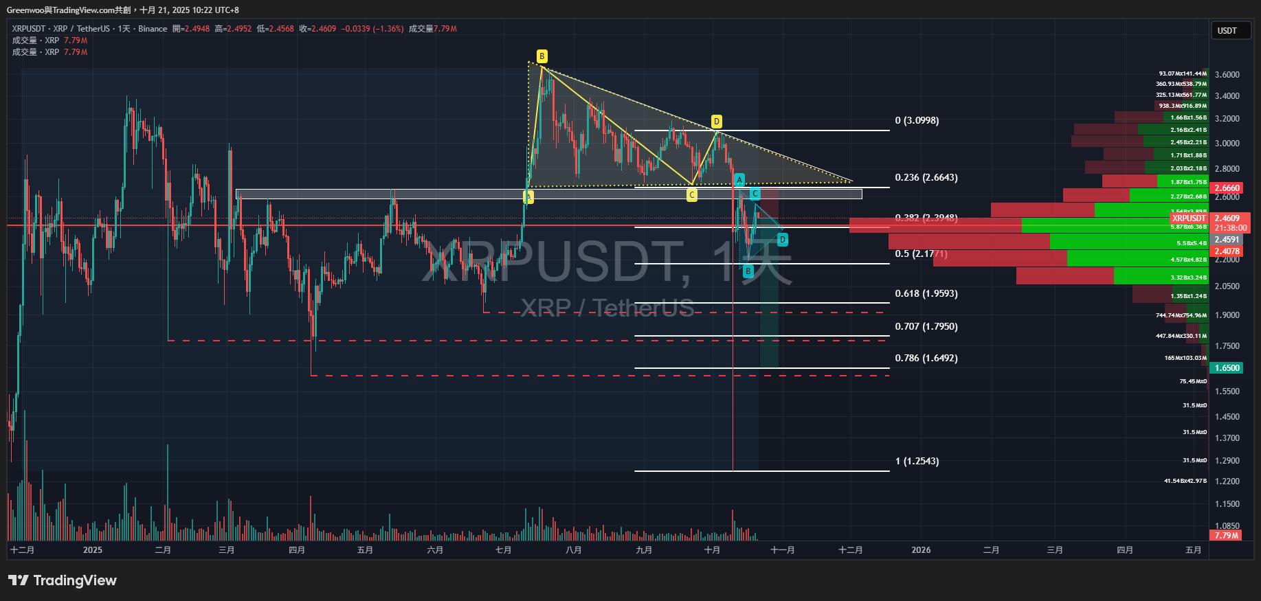 XRP在10月10日的崩跌前就已经有筑顶现象,价格形成下降三角形(黄色三角形),且持续创新低。在10月10日崩跌后,虽然价格迅速反弹回升,但始终无法图破三角形下方压力。尽其价格回弹至2.646美元后受阻下跌,受阻位置略低于斐波0.236级别。价格后续于斐波0.5附近反弹上升,但又于2.5529美元受阻,价格形成潜在旗形(蓝色三角形),显示跌势可能延续。