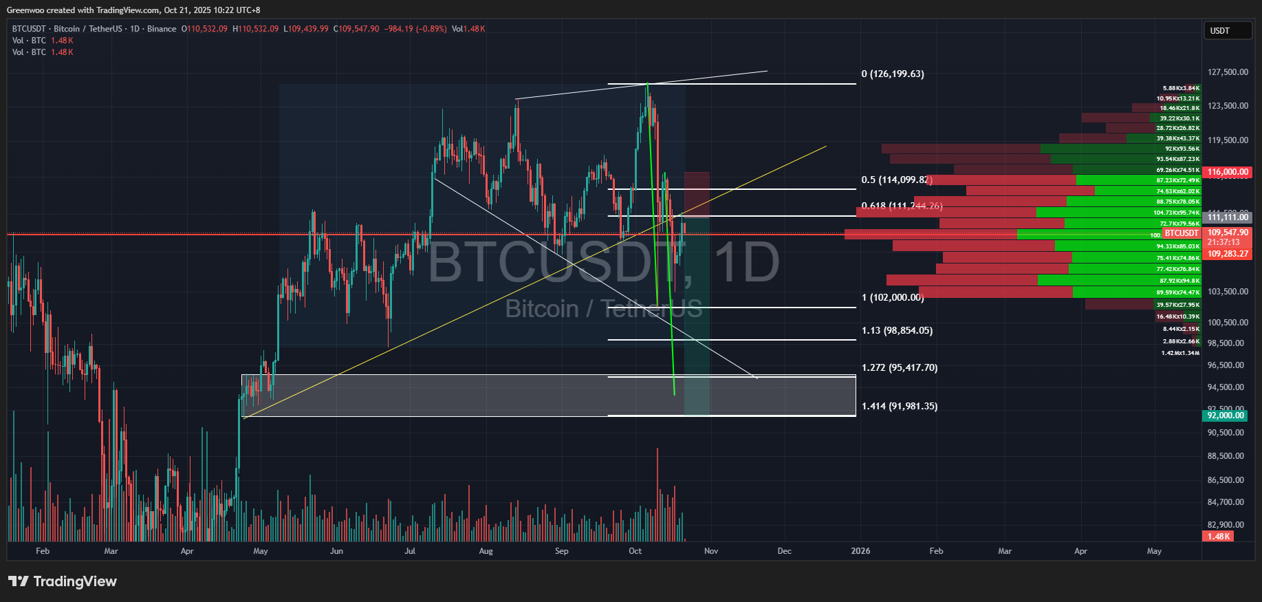 BTC rose to $111,705 yesterday (10/20), but trading volume did not increase alongside the price; instead, there was a trend of decreasing volume during the rise. This level also coincides with the lower edge of the ascending trend line and around the Fibonacci 0.618 level, presenting a certain degree of resistance. From a medium-term perspective, the price has formed an expanding top pattern (two white trend lines), with strong bearish implications.