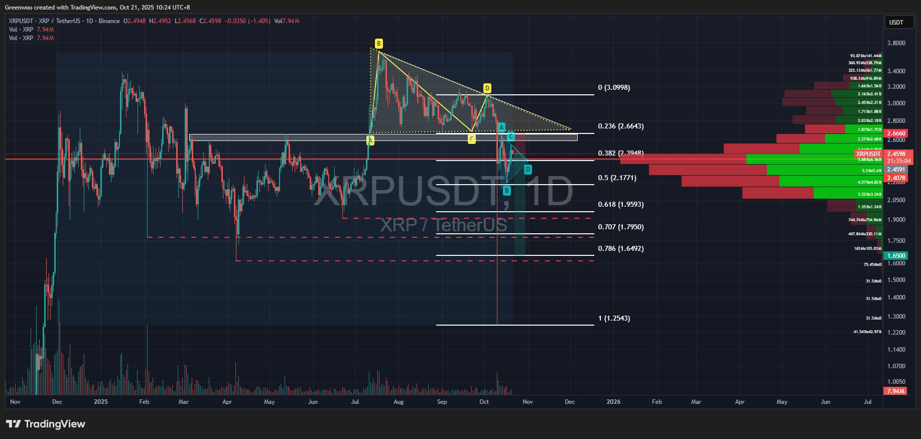 XRP showed signs of topping before the sharp drop on October 10, forming a descending triangle (yellow triangle) and continuously making new lows. After the sharp drop on October 10, although the price quickly rebounded, it has been unable to break above the lower pressure of the triangle. The price rebounded to $2.646 before encountering resistance and falling, with the resistance slightly below the Fibonacci 0.236 level. Subsequently, the price rebounded near the Fibonacci 0.5 level but encountered resistance again at $2.5529, forming a potential flag pattern (blue triangle), indicating that the downtrend may continue.